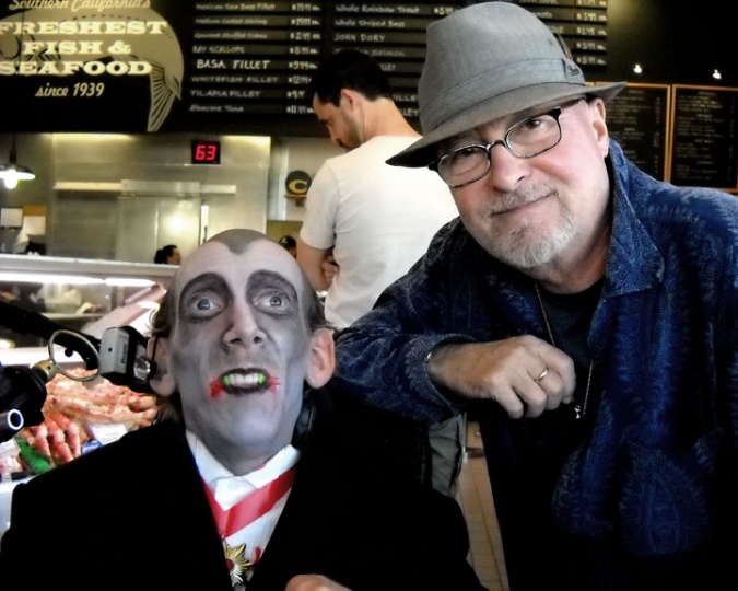 During lunch today at the Santa Monica Seafood Oyster Bar, a gentleman whizzed in driving a motorized Stephen Hawking-style wheelchair. At first glance from the side, I noticed his bluish skin color and thought it might be his last lunch, but then I realized he was Count Dracula.